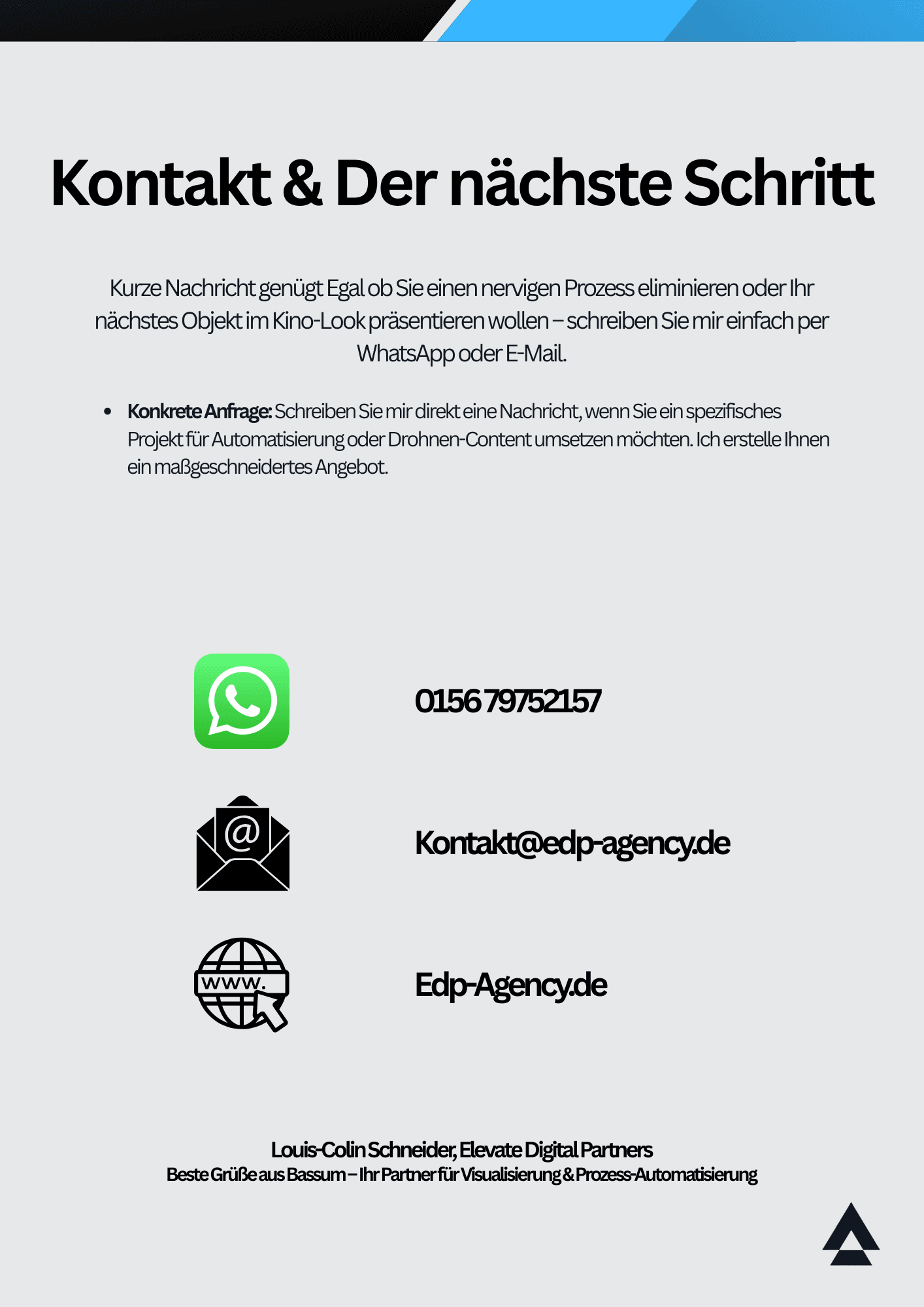 Schon seit meiner Kindheit haben mich zwei Dinge fasziniert: Die Kontrolle über ferngesteuerte Flugobjekte und die Magie von Prozessen, die wie von Geisterhand automatisch funktionieren. Was damals als Hobby begann, habe ich heute zur EDP Agency perfektioniert.